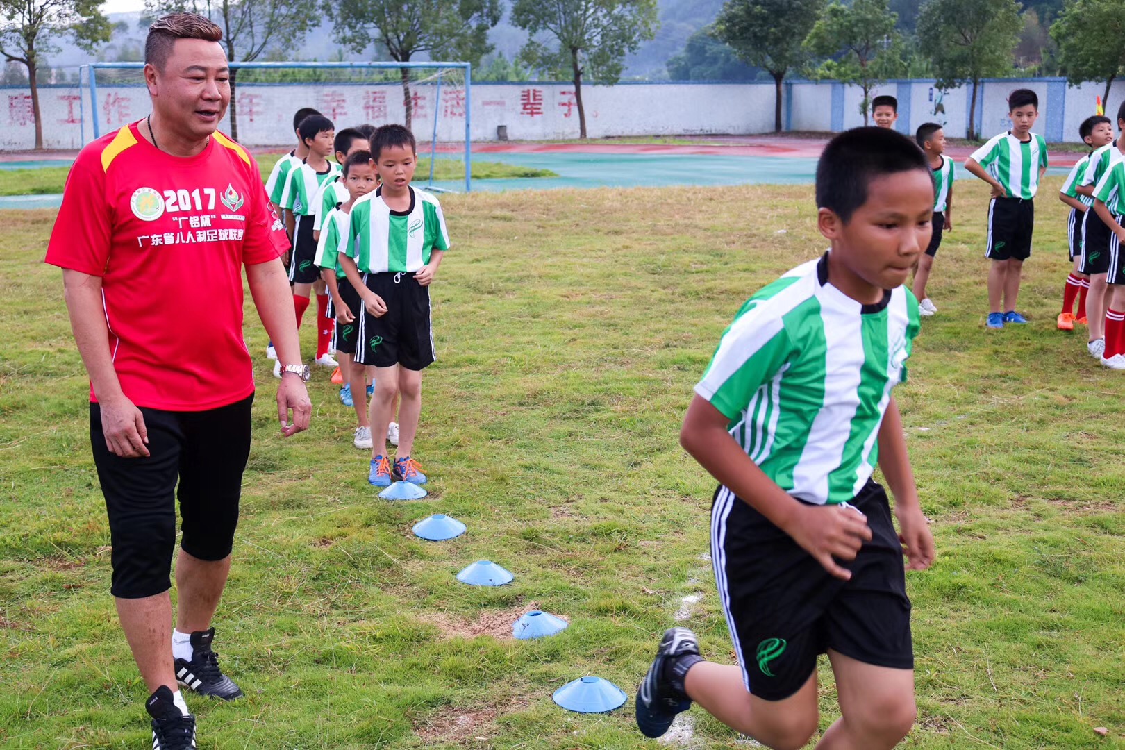 前中國青年足球隊主教練麥超,廣東省廣鋁公益基金會秘書長周楠,新興縣教育局及體育局領導、里洞鎮領導,前太陽神隊員及廣州聲色體育技術總監何錦波一行人來到里洞鎮中心小學,號召關注中國足球發展的熱心人士共同加入公益活動中。
