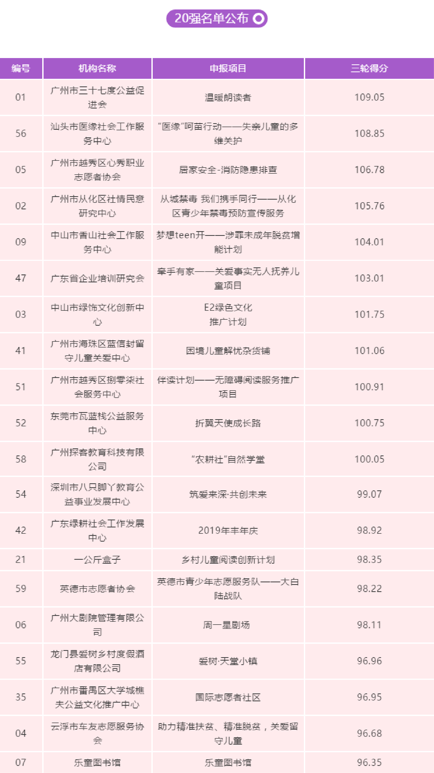 本次活動得到社會各界積極響應,共有80個公益創新項目報名參與,經過持續3個多月的初選,網絡投票和可持續性報告打分三項評選,20強順利誕生!