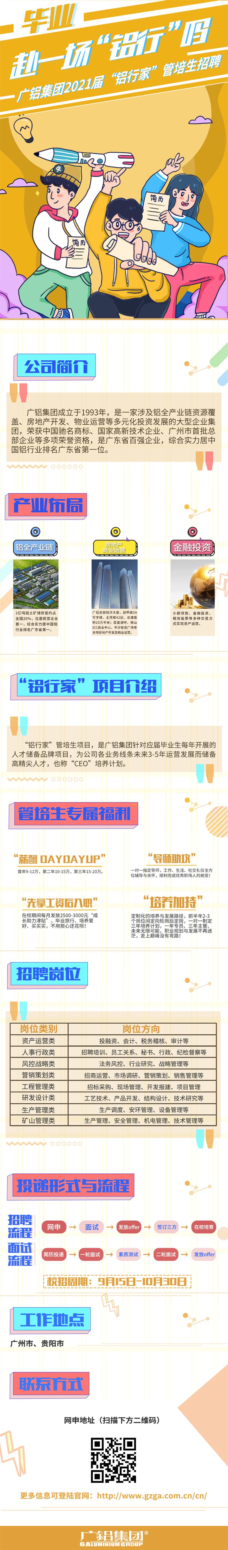 聯系廣鋁 集團總部 分支機構 人才招聘 社會招聘 校園招聘 招商加盟 留言 下載 廣鋁手機APP 廣鋁 for Android 手機助手掃一掃 廣鋁 for iPhone 手機助手掃一掃 ———————————— 廣鋁集團微信公眾號 添加方式: 微信號請搜索:GaluminiumGroup 中文昵稱請搜索:廣鋁集團 或直接用手機微信 掃描左側二維碼 ———————————— m.hbchaoyi.cn 畢業,鋁行 | 廣鋁集團2021屆校園招聘正式啟動!