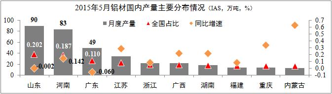 發(fā)稿時(shí)間:2015-07-17鋁材市場保持較快增長。監(jiān)控?cái)?shù)據(jù)顯示,自3月以來,我國鋁材月度產(chǎn)量均保持兩位數(shù)的增長速度,其中5月份全國鋁材產(chǎn)量444萬噸,累計(jì)同比增長10.7%,增幅環(huán)比回落1.6個(gè)百分點(diǎn)。從區(qū)域分布上看,山東、河南以及廣東仍然保持鋁材產(chǎn)量前三的位置,其中廣東5月份鋁材產(chǎn)量49萬噸,全國占比11%,但同比增速較上月回落了6%,降幅收窄0.3個(gè)百分點(diǎn)。