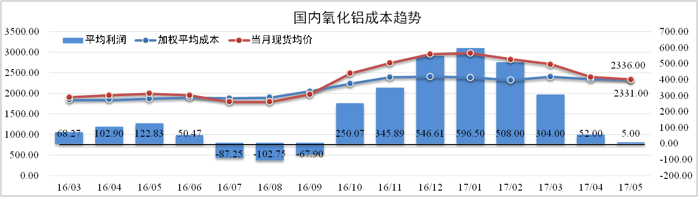 分析認(rèn)為:6月份,國內(nèi)煤炭和片堿價(jià)格有所下降,但鋁土礦供應(yīng)受國內(nèi)環(huán)保督查影響將出現(xiàn)緊缺局面。預(yù)計(jì)氧化鋁成本將穩(wěn)中有所下降。