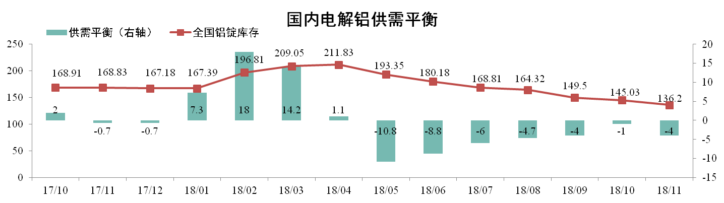 據(jù)阿拉丁數(shù)據(jù),11月原鋁產(chǎn)量301萬噸,凈進(jìn)口1萬噸,總供應(yīng)量為302萬噸,消費量為306萬噸,當(dāng)月理論供應(yīng)短缺4萬噸。11月底全國鋁錠庫存136.2萬噸,環(huán)比下降6.09%。