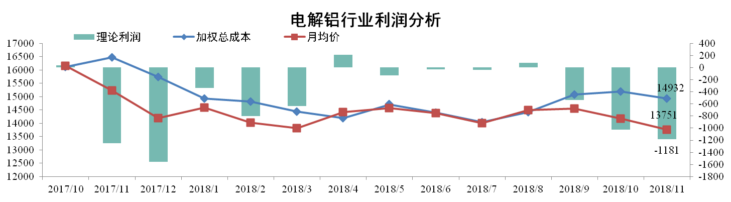 11月份電解鋁行業(yè)加權(quán)平均成本為14932元/噸,環(huán)比上升0.78%。同期國內(nèi)現(xiàn)貨均價報13751元/噸,環(huán)比下降2.98%。行業(yè)理論利潤為虧損1181元/噸。