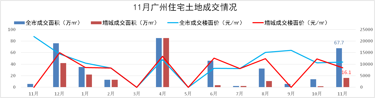 11月廣州市共推出26宗地塊,分別為25塊住宅用地和1塊商業(yè)用地,推出面積216.4萬㎡。商住用地共成交12宗,成交面積74.7萬㎡,成交樓面價(jià)10045元/㎡。