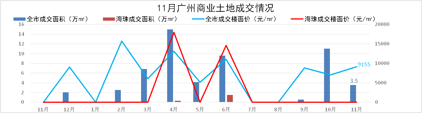 全市:11月共成交2宗商業(yè)地塊,成交面積3.5萬㎡,成交樓面價(jià)9,155元/m2,無溢價(jià);琶洲區(qū)域暫無土地成交。