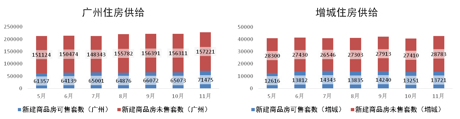 分析認為:由于本月全市住宅成交整體下降,加上供應保持水平量,致使市內庫存量上漲。同理,增城在11月以等待政策優化為主基調,各樓盤推貨明顯放緩,區內庫存較上月有所增加。