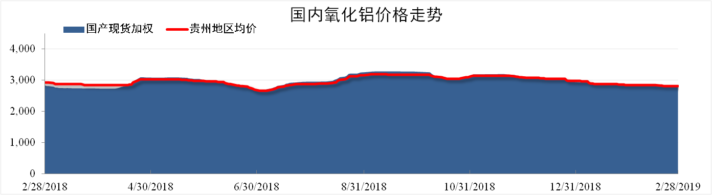 截至2月28日,國(guó)產(chǎn)氧化鋁現(xiàn)貨加權(quán)均價(jià)為2812元/噸,同比下降0.81%,環(huán)比下降2.18%。貴州地區(qū)氧化鋁現(xiàn)貨加權(quán)均價(jià)為2829元/噸,同比下降3.37%,環(huán)比下降2.22%。