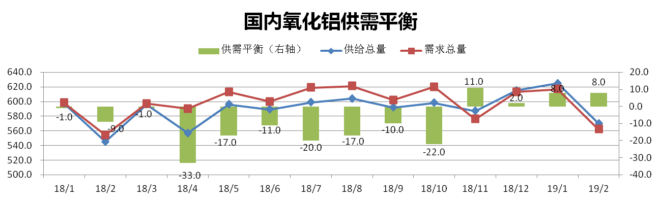 分析認(rèn)為:2月礦石供應(yīng)逐漸穩(wěn)定,氧化鋁產(chǎn)量有所下降,下游需求仍舊疲軟,氧化鋁供給過剩。2月氧化鋁價(jià)格仍處于低位,部分企業(yè)將出現(xiàn)適度減產(chǎn),但因需求下滑,氧化鋁仍舊供過于求。