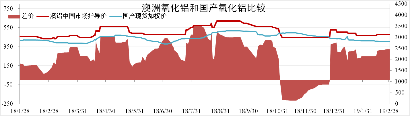 分析認(rèn)為:2月受國(guó)內(nèi)氧化鋁價(jià)格回落影響,與進(jìn)口氧化鋁價(jià)格差倒掛結(jié)束。2月國(guó)產(chǎn)氧化鋁價(jià)格持續(xù)回落,澳鋁中國(guó)市場(chǎng)指導(dǎo)價(jià)波動(dòng)較小,預(yù)計(jì)進(jìn)口氧化鋁價(jià)差緩慢拉大。