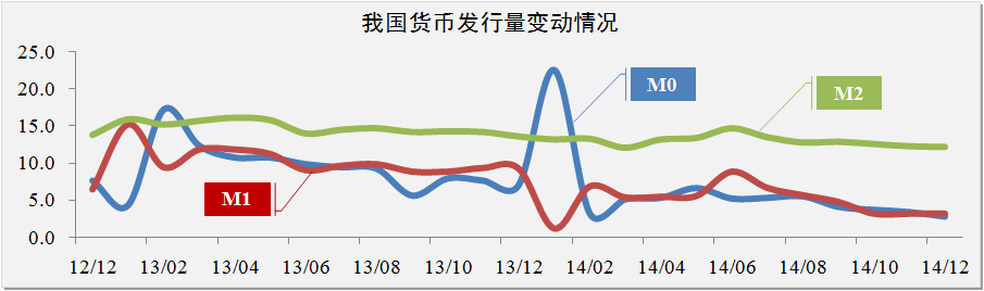 貨幣市場方面。2014年度我國M1的回落速度明顯高于M2的回落速度,表明銀行的定期存款增加,市場交易活力下降。綜合分析近年來我國貨幣發行量,2014年度貨幣發行量同比減少35%,但由于我國基礎貨幣流向存在不均衡特點,穩健的貨幣政策在抑制投資過熱的同時,也加劇了部分行業市場出現通貨緊縮的風險。研究認為,2015年央行將在穩健的基礎上進一步強化定向寬松貨幣政策,并將在銀行業以及制造業方面會有所寬松舉措。