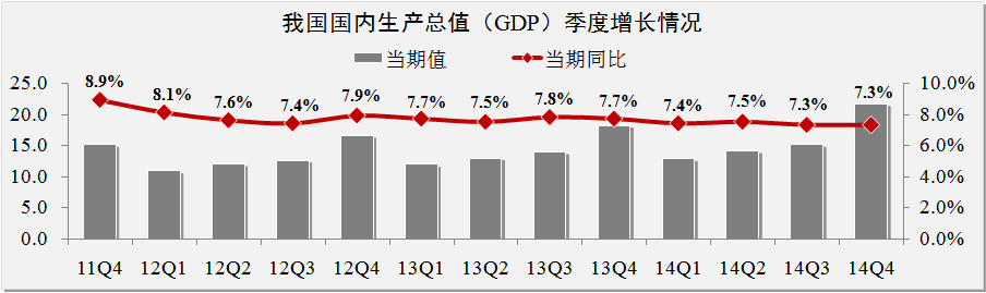 發稿時間:2015-01-232014年度我國國內生產總值為63.6萬億元,同比增長7.4%,較2013年下滑0.4個百分點。其中,第一產業同比增長4.1%,第二產業同比增長7.3%,第三產業同比增長8.1%。IMF預計2015-2016年我國經濟增長速度將繼續維持放緩趨勢,年度增長率分別為6.8%和6.3%。研究指出,現階段國內當局更加注重化解短期信貸以及投資擴張帶來的資產負債表脆弱性風險。