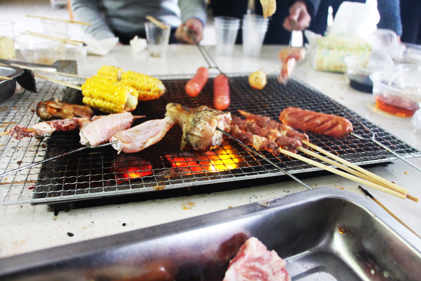 當食物擺滿桌面,各位燒烤達人已經摩拳擦掌,迫不及待想要一展身手。各位吃貨也被彌漫周圍的烤肉香引得口水直流。一串串烤肉、一塊塊雞腿,更有肥美無比的生蠔,不僅消除了大家一周工作中的疲勞,也在美味中拉近了大家的距離。