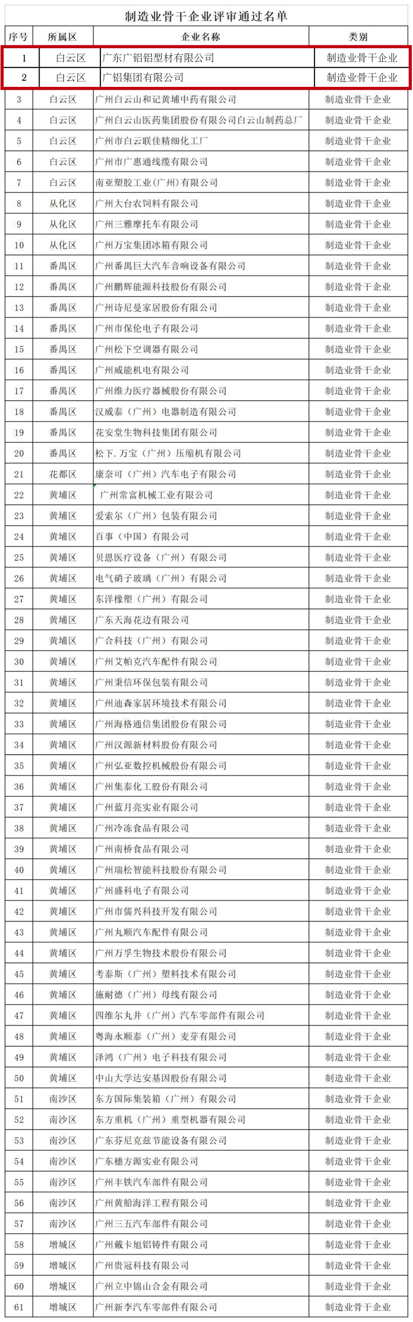 發稿時間:2019-03-01日前,廣州市工業和信息化委員會公布了“三個一批”企業入庫名單(第二批):制造業骨干企業61家、兩高四新企業375家、小升規培育企業712家。廣鋁集團入選為“制造業骨干企業”,廣東廣鋁鋁型材有限公司分別入選為“制造業骨干企業”、“兩高四新企業”。