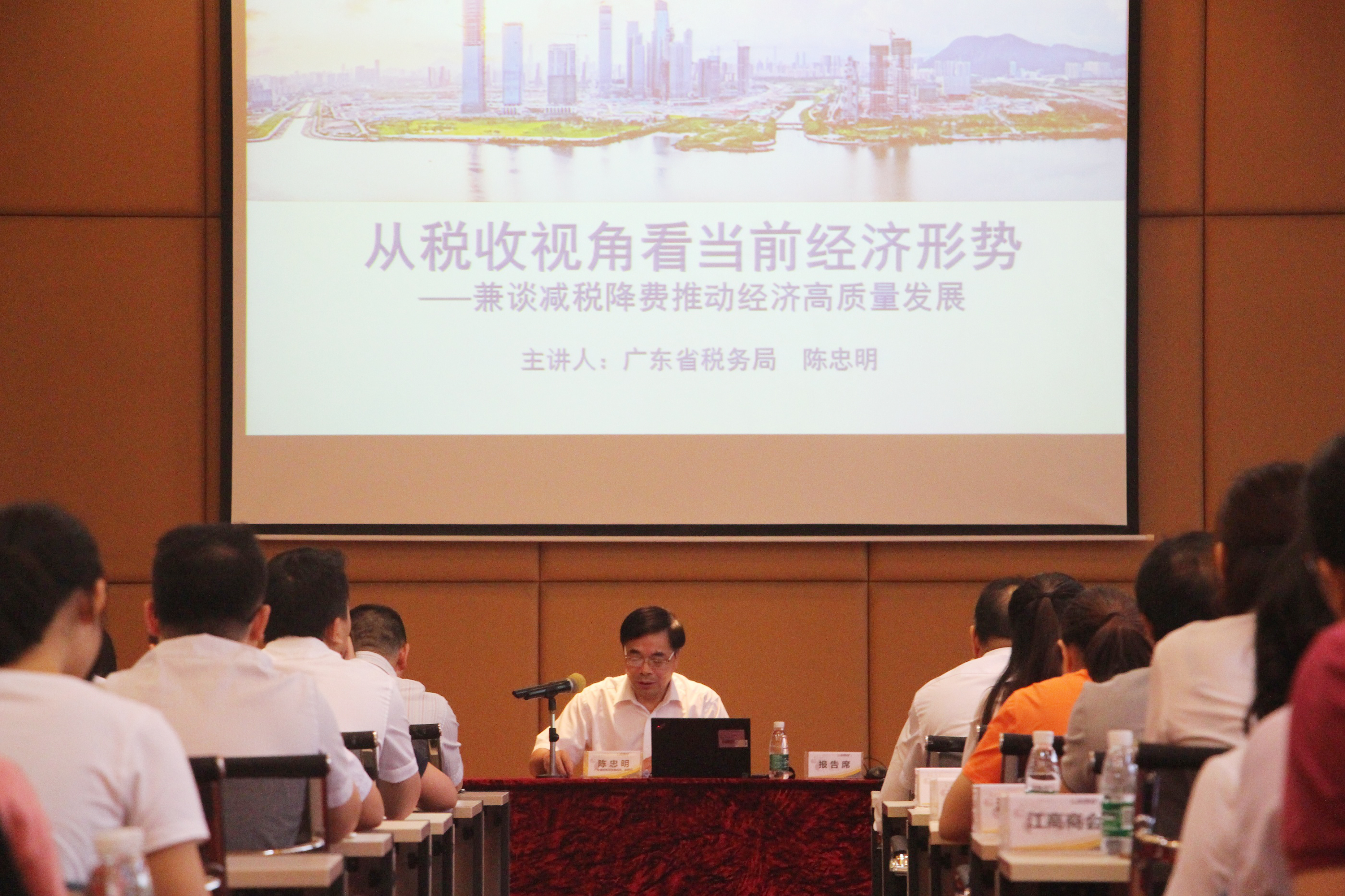 報告會上,陳忠明副局長主要針對“從稅收視角看當前經濟形勢”、“落實減稅降費促進經濟高質量發展”、“廣東落實減稅降費工作成效”三個方面深入闡述了目前中國、廣東省的經濟形勢。他指出,2018年以來我省經濟數據顯示目前主要宏觀經濟指標保持在合理區間,市場信心明顯提升,新舊動能轉換加快,廣東經濟實現穩中求進、穩中向好。