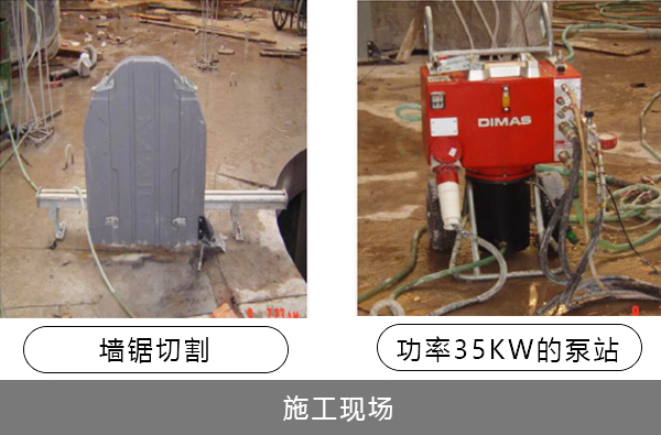 由于結構中含有的鋼筋太多 強度太高,傳統的水鉆排孔方式已經不能夠拆除,液壓剪也無法使用,所以使用進口大功率液壓墻鋸切割。
